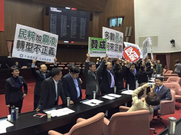 為了推動轉型正義,民進黨提出《促進轉型正義條例》草案並於2016年4月15日首度在立法院進行表決。想當然耳,國民黨不想被台灣人知道當年國民黨戕害台灣人民的黑幕歷史,所以極力反對。國民黨除了抗議外,也高舉「轉型不是抄家、追殺不是正義」、「多數暴力何來正義」、「民粹加霸凌、轉型不正義」等標語,並高喊「反對多數暴力」強力杯葛《促進轉型正義條例》(促轉條例)。