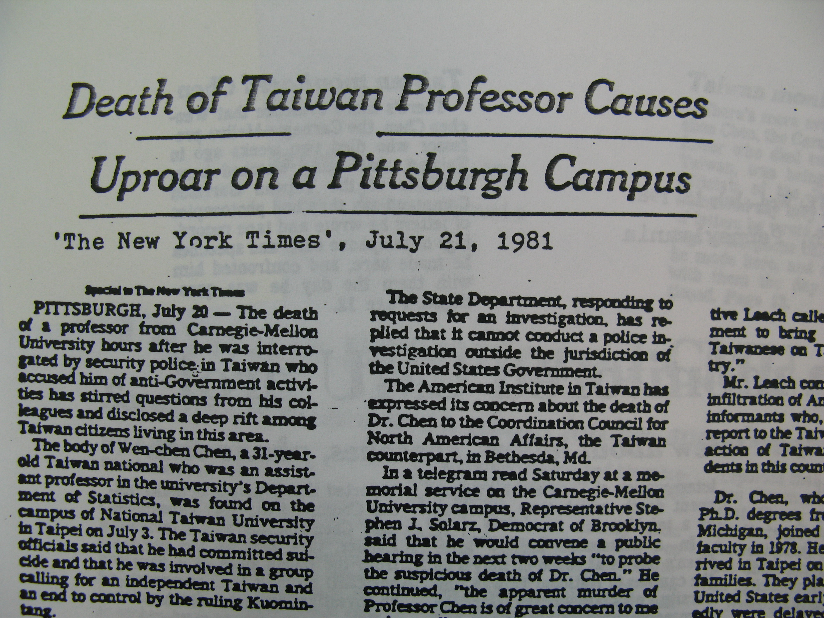 美國匹茲堡卡內基美倫大學(Carnegie Mellon University)教授陳文成在1981年5月返台探親,7月2日被警總以「美國地區有人檢舉陳文成旅美期間的一些行為和活動,有必要請他說明、澄清」為由約談陳文成。7月3日清晨,陳文成陳屍在母校台灣大學校園中。