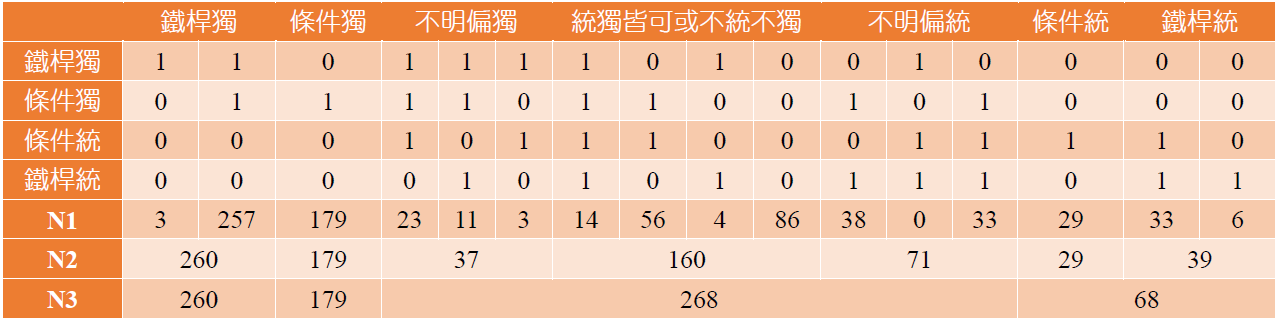 如果真正細分,鐵桿獨、條件獨、條件統、鐵桿統等四題僅以「贊成(1)」和「不贊成(0)」作區分,則可以得出16種結果。筆者將分類結果與實際的受訪者人數列於下表,左方項目是原始題目的類別,上方項目則是筆者認為較嚴格的分類方式。N1指的是16類中的各項目人數,N2則是筆者分類後的人數,N3則是只將量表分為「鐵桿獨」、「條件獨」、「不明、皆可或不統不獨」、「偏統派」等四類的人數。