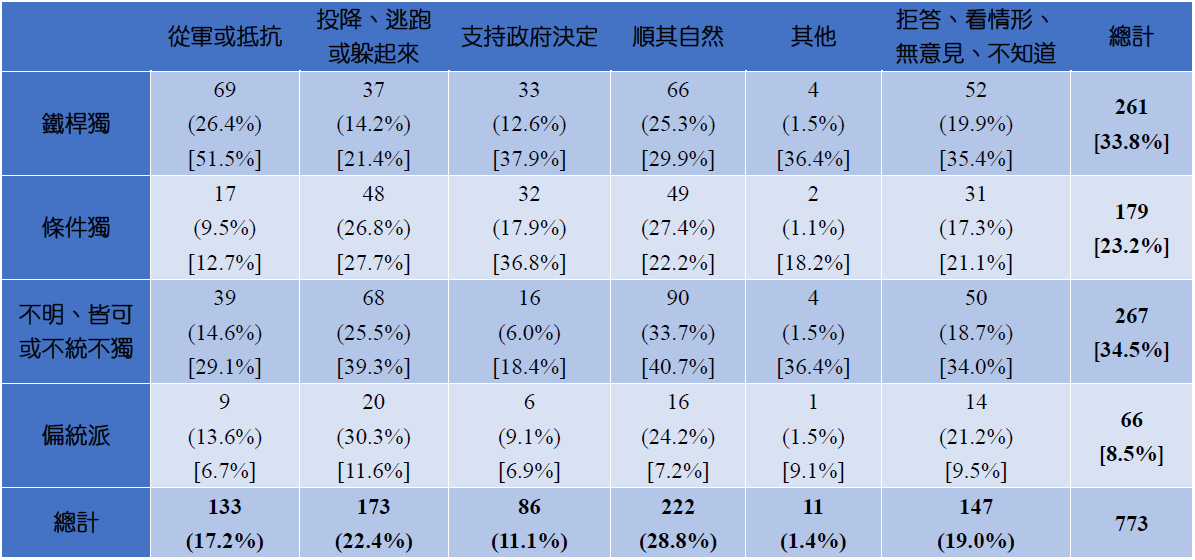 首先,當臺獨戰爭爆發時,在鐵桿獨中,比例最高者是從軍與抵抗,佔26.4%;而原本就對臺獨戰爭有疑慮的條件獨中,比例最高的是選擇逃跑、投降或躲起來,佔26.8%。此外,立場不明、統獨皆可或不統不獨者,在臺獨戰爭發生時選擇順其自然的比例最高,達33.7%;最後,偏統派在臺獨戰爭爆發時,選擇逃跑、投降或躲起來的比例是最高的,有30.3%。