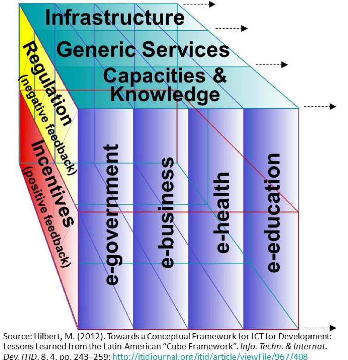 根據ICT4D(information communication technology for development),我們可以清楚從這個立方體看出三個面向,綠色水平面分為三個部份:硬體的建設、軟體的研發和人類的使用,在這個科技飛速發展的時代,軟體和硬體發展都超乎我們預料,但人類對大數據(Big Data)的認知還是稍微欠缺一些,所以學這方向專業和做這方面工作的人都是很有錢途的。