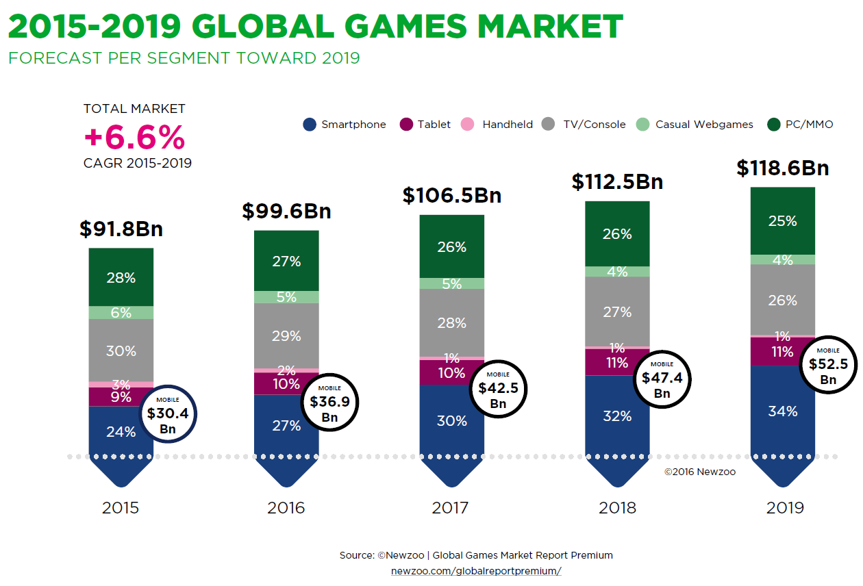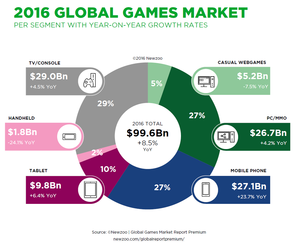 電玩遊戲的產值規模究竟有多大?根據newzoo 的最新報告「2016 Global Games Market Report」,2016年遊戲消費收益產值預估為996億美元,2019年將成長到1186億美元。在2016年的遊戲載具分類上,傳統電腦桌機遊戲為319億美元(32%),年成長率2.1%;傳統家用遊戲與插卡式遊戲308億美元(31%),年成長2.2%;手機與行動遊戲369億美元(37%),年成長率達到21.3%。以成長率來看,就是目前風靡全球的「Pokémon GO」載具系統成長度最高。