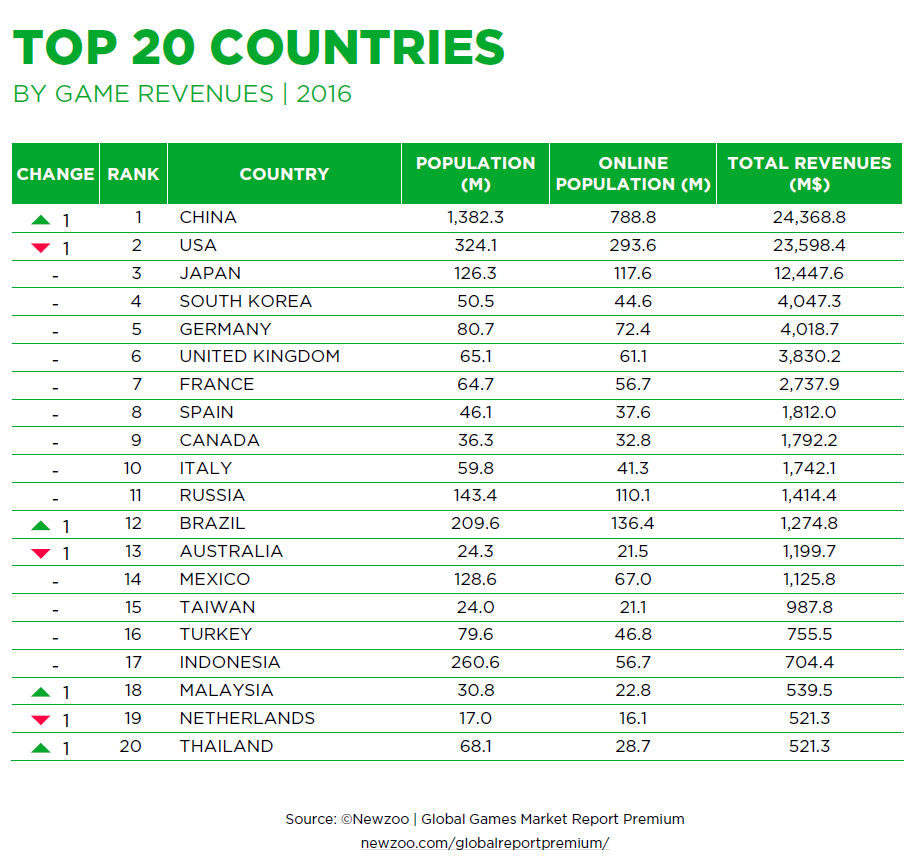 以國別區分,2016年,排名第1是中國,市場消費收益額達到243.688億美元;第2名美國235.984億美元;第3名日本124.476億美元;第4名韓國40.473億美元。至於台灣,雖然台灣線上遊戲人口數全球排名41名,但是消費收益額卻是第15名,達到了9.878億美元。