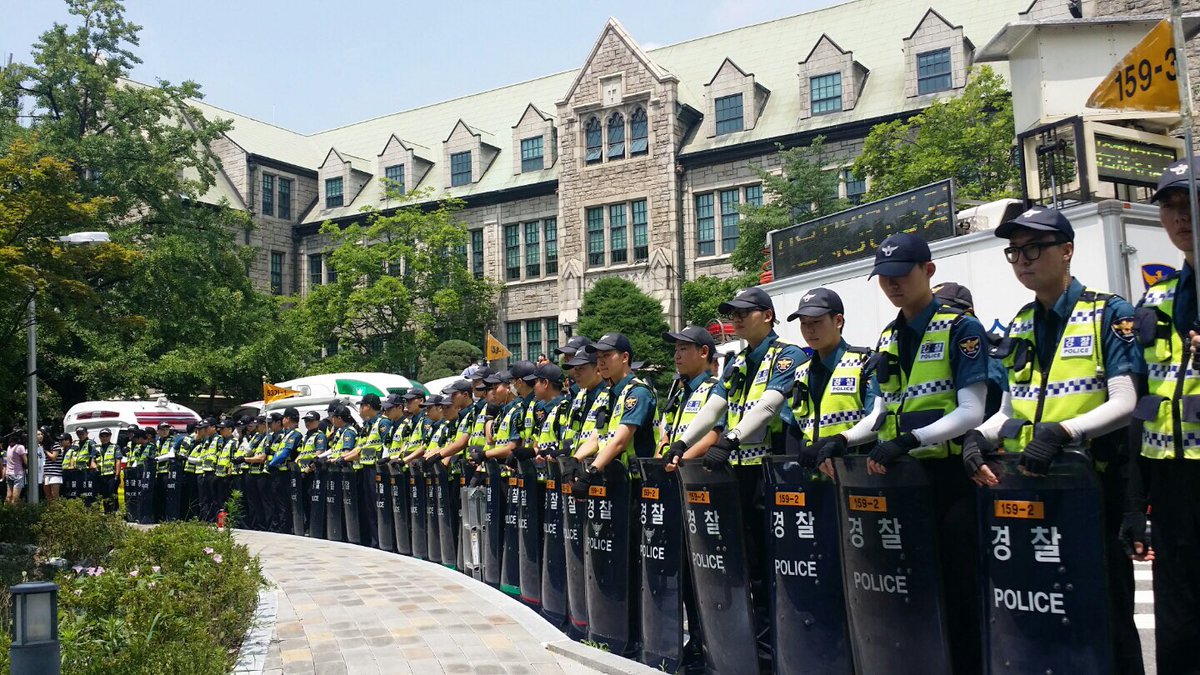 上次有這麼多警察在校園展開行動,是1999年4月,漢城地下鐵工會為反對資方調整經營結構而展開罷工,並進入漢城大學內展開靜坐,由於當時仍為正常上課期間,最後當局派出2000名警力進駐,試圖驅散工會成員,相隔17年,公權力進入學校的情況再次上演。