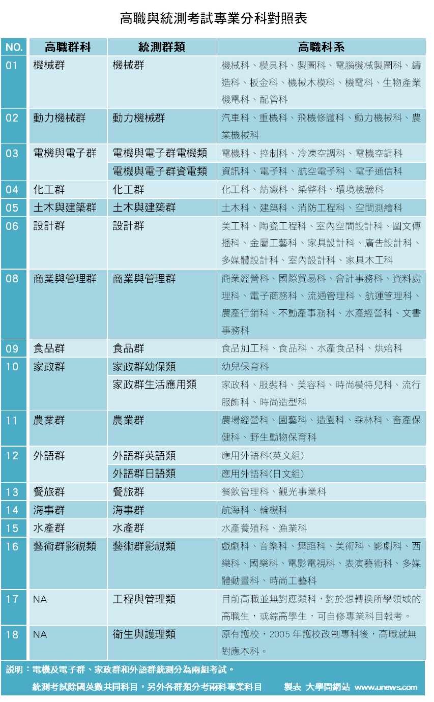在廣設大學之前,許多不愛念書的青少年,選擇讀高職、五專,學會一技之長,直接投入就業市場,透過實作、技能學習闖出一片天。可是,高職的課程隨著社會需求和價值觀改變跟著調整,以因應學子及家長對於未來升學所好。可是,高職畢業後升四技二專的統測考試當中,卻與高職實際提供的系科無法完全對應。(表1)
