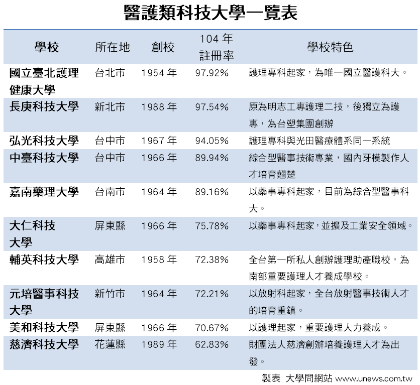 以國立臺北護理健康大學(國北護)為首的醫護類科技大學共有10所,檢視其近年來的新生註冊率,平均值低於其他類工業、商業類型的科技大學。就算醫護類龍頭國北護,104年新生註冊率在13所國立科大中,排名第11,僅高於以農業起家的屏科大,以及遠在離島的澎湖科大。(表2)