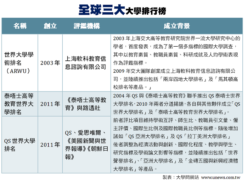 能否擠進全球最佳大學評比的排行榜,也是許多學校作為招生的重點文宣指標。然而,仔細探究全球各大大學排行榜的評鑑機構背景,其實都是商業營利機構或媒體,他們主要業務除了廣告、行銷外,要不就是提供大學策略評估的諮詢顧問公司。其中,來自英國的「泰唔士高等教育世界大學排名」及「QS世界大學排名」本為一家,後來兩個團隊因理念不合,各自獨立尋找其他合作夥伴另起爐灶。
