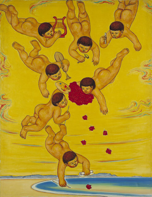 這時候的何德來,從他的創作呈現出,對和平、自由、安樂與健康的嚮往。代表作《今日仍在描繪和平之夢》描繪從天而降的孩子們如同天使一般,拿著樂器與彩筆,甚至從天空灑落下玫瑰花瓣,畫面呈現出無比的祥和與光明。