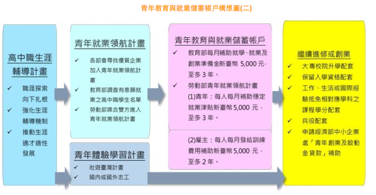 教育部在這個月提出了「青年就業領航計畫」和「青年體驗學習計畫」,從明年(2017)開始,高中應屆畢業生選擇提早就業,可以向政府申請每月10000元的補助,存入個人專屬的「青年教育與儲蓄帳戶」當中,每位畢業生最多可以連續申請三年,意謂著三年後,就能提領36萬的基金,作為未來繼續升學或創業的第一桶金。