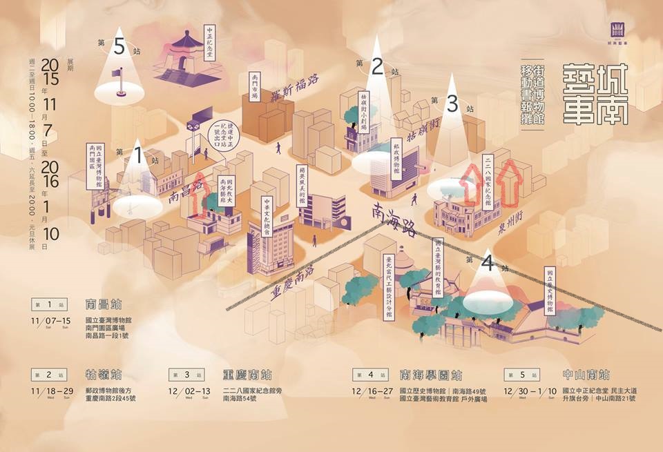 曾於過去兩年(2014、2015年)連續舉辦的「城南藝事」藝術節,據筆者實際踏訪城南街區,已成為博物館與社區商家的共同回憶。其中負責串聯館舍展演合作、社區協力參與以及公部門協調的策展人黃義雄回憶,「城南藝事」希望活動形成一個去中心的網絡,再連結至多個子網路。它可能是館舍單位展覽的合作機制、居民與藝術活動的互動關係、觀眾對城區事件的參與發掘、展演模式的原創性、產生的衍生效益(社會的、經濟的)。在北美館未興建之前,城南就是發揚台灣美學的重鎮,許多知名藝術家、文學家都是在城南揚名,像是1976年在美國新聞處(現二二八國家紀念館)的「洪通首次個展」,每天吸引數萬人參觀,造成無比的轟動,不僅美國時代周刊專文報導 、瑞士洛桑的原生藝術館更收藏洪通作品。