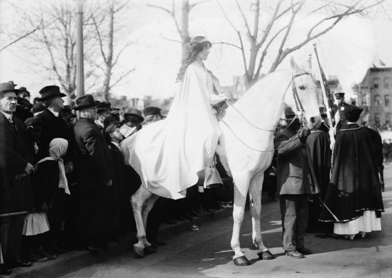 1913年3月3日,美國華盛頓特區,一個年方27的年輕女孩 Inez Milholland,披著象徵正義的聖女貞德白袍,騎著白馬,率領5000人從國會沿著賓夕法尼亞大道,前往白宮。她們遊行的訴求是為爭取婦女投票權,海倫凱勒也在遊行隊伍中。