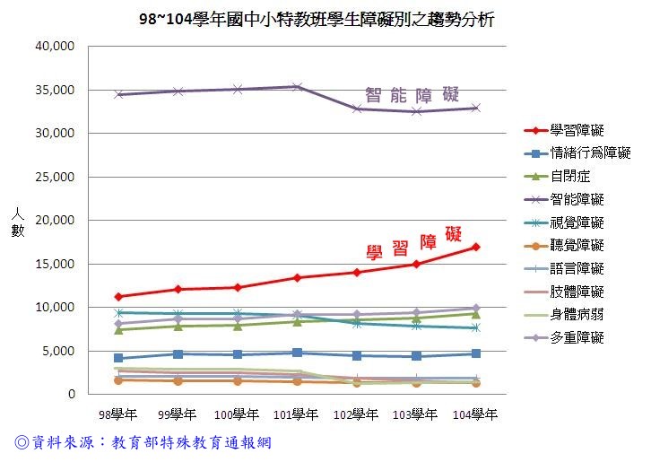 身心障礙在總人口數中有其一定比例,隨著少子女化趨勢,特教學生(如智障)自然也會逐漸減少,但98學年度至今國中小「學習障礙」學生人數卻呈急遽增加(達五成之多),104學年度已近1.7萬人之多。