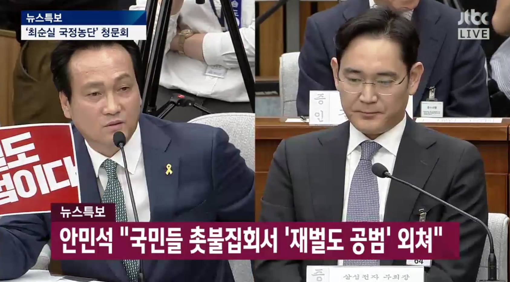 安議員拿出民眾倒朴示威舉起的標語,他說道:「國民們不僅要求朴總統下台了,也主張財閥是共犯。我先向李在鎔證人提問,財閥是共犯嗎?」