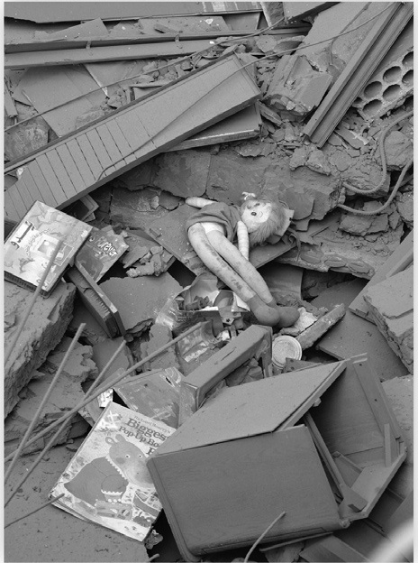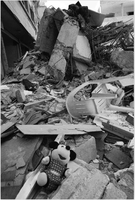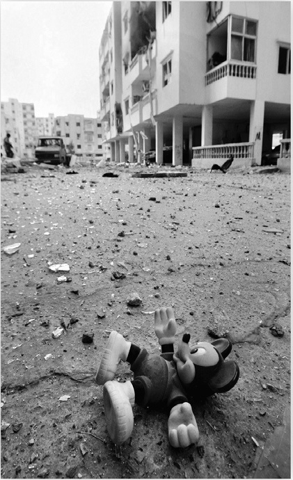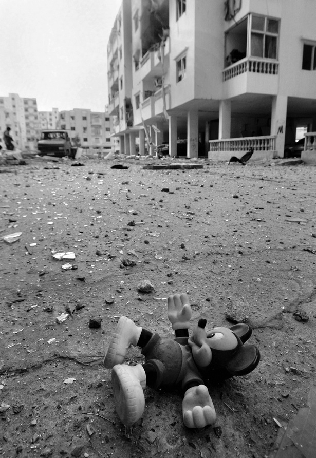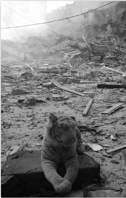 我不知道其他照片是什麼時候拍的。在報導摧毀事件時,我們總是把焦點擺在細節上,而不會去拍攝被摧毀的建築物全景。倘若我那張照片裡沒有那個玩具,你不會知道那些建築物是什麼。那也可能是辦公大樓區,有各種可能。因此,把米老鼠納入畫面之中,可以為照片增添人的元素。你可以約略感覺到那裡發生了什麼事、那是什麼類型的地區,它會提供些許事實的脈絡,讓你知道該地最近遭到空襲。