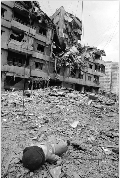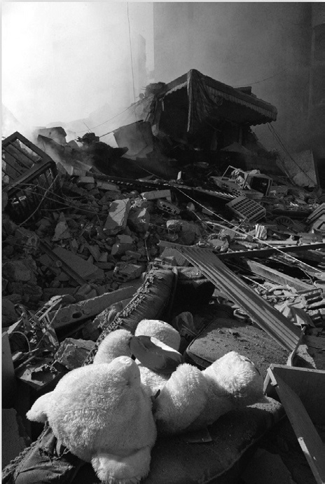 柯提斯……… 那是在泰爾一個集合住宅區遭受多次攻擊之後拍的,以色列說,那裡是真主黨的作業基地。非常大規模的攻擊。我們聽到巨大的爆炸聲響時,人就在泰爾醫院外面,可以看到不遠處的硝煙。我們馬上趴下。大約過了10到15分鐘,我和其他記者抬起頭張望,發現有幾棟多層樓公寓被夷為平地。我拍的照片裡面,有一張是馬路上的玩具米老鼠。有很多部落客認為,一定是有人把米老鼠擺在那裡或移到那裡,或是擺到馬路中間,事實當然不是這樣。正對面的建築物還沒被夷平,公寓裡有一半的東西散落到街上。有沙發、小孩的玩具、書—就是平常公寓裡會有的那些東西,全都散落四處。有趣的是,當我把這張照片傳回去時,在美聯社坐辦公桌的編輯打電話給我說:「班,我們必須問你,你到達現場時那個玩具就在那裡了嗎?你有移動它嗎?它是被擺在那裡的嗎?不管是你或其他媒體,有對它做過任何移動嗎?身為編輯,有時候就是得問攝影師這些問題。即便很信任跑現場的人,有時你還是必須把這些問題問過一遍,以便確保我們送出去的東西正確無誤。」