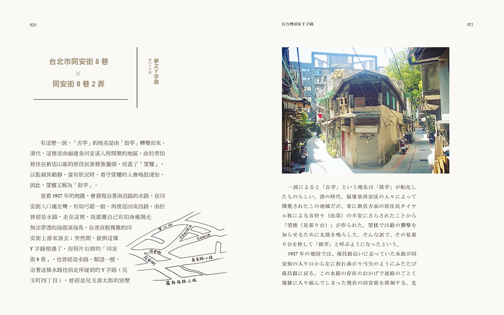台北留下許許多多的Y字路。藉由對照以前的地圖,可以了解到Y字路的形成過程,並且挖掘出埋藏其中的故事,當我意識到這一點時,台北的街道,從原本尋常的三度空間,突然變成四度空間,宛如戴上IMAX電影的3D眼鏡一般,原本早已遺忘卻埋藏其中的「消逝的時光」倏忽出現,歷歷在目。從那天起,我開始著迷於尋找Y字路,雖然不是捕捉寶可夢,然而我卻像在捕捉Y字路般地穿梭於台北的大街小巷之中。