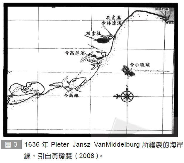 由這些文字紀錄可以發現,透過荷蘭東印度公司的空間連結,屏東平原逐漸與外界聯繫,屏東平原的面貌也逐漸被揭開,而對外聯繫的管道,即是放索社(現林邊鄉水利村)與下淡水社(現萬丹鄉香社村)(圖2);而自然環境也被地圖記錄了下來,尤其是海岸線,揭開了屏東平原對外聯絡的孔道,這些都不是能夠從現今的地表景觀所能夠推論的部分。在荷蘭古代的海圖裡,能清楚地畫出現今高屏溪與東港溪的出海口,顯示荷蘭船隻到此活動的紀錄,向內退縮的海灣(圖3),正適合船隻停泊,這也說明在金獅島戰役中,全部隊可以轉泊下淡水的緣故,由此見得,在荷蘭時期已經打通屏東平原對外聯絡的管道,而主要的航點就是放索與麻里麻倫(下淡水社)兩個地方,這兩個地方也就成為屏東平原空間脈絡的起點。