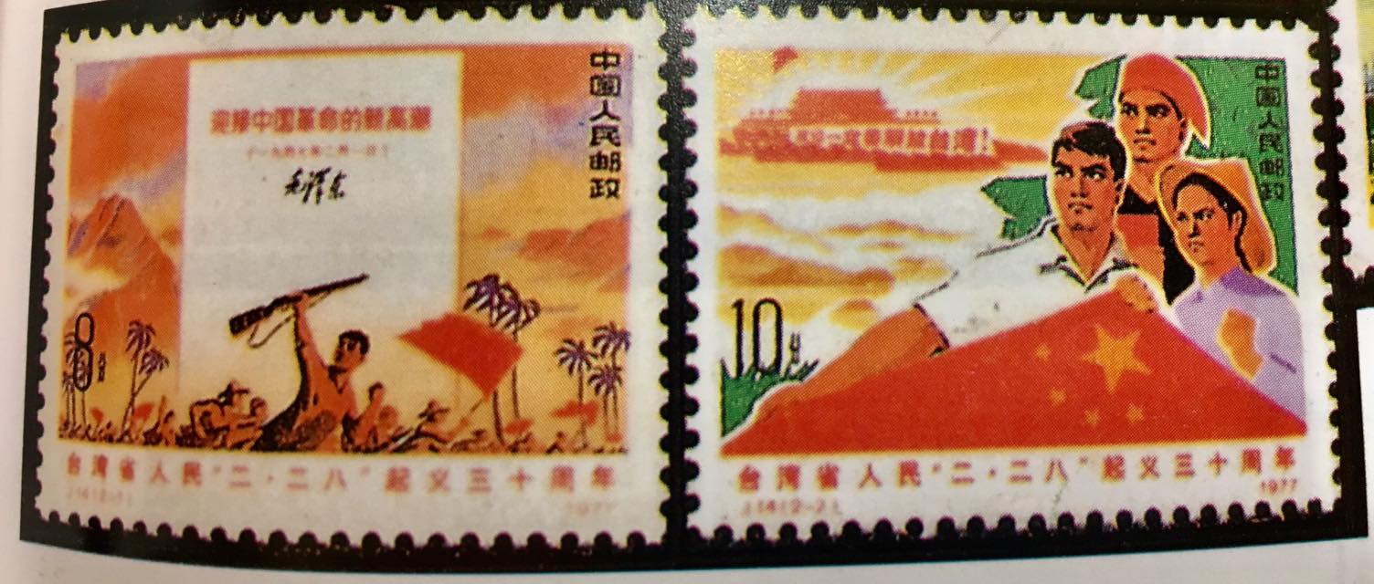 這世界上的第一套228郵票是中華人民共和國發行的,時間是1977年,目的在紀念台灣人民抗暴30周年;所謂抗暴指的是國民黨的暴政,在郵票設計上我們可以看到毛澤東的著作「迎接中國革命的新高潮」,三位「台灣青年男女」手持五星紅旗,後方是天安門的「我們一定要解放台灣」標語。