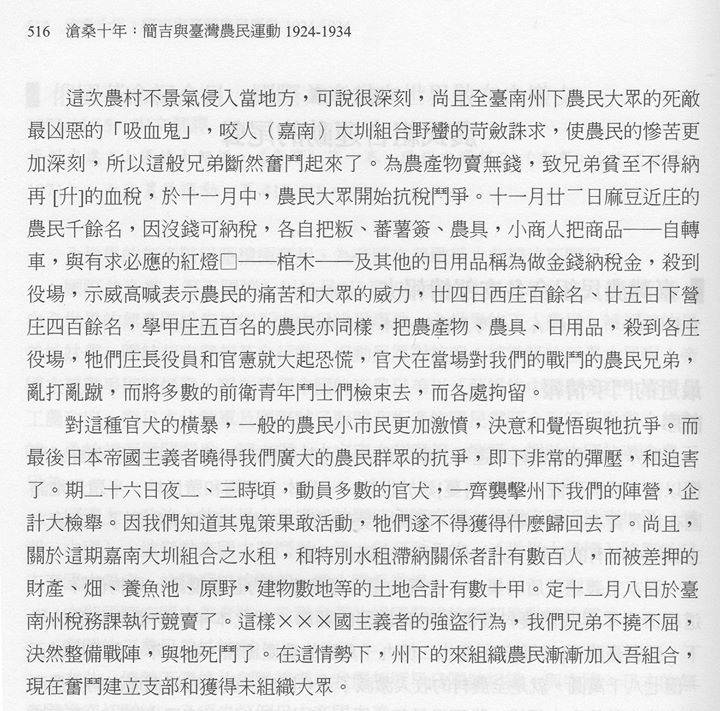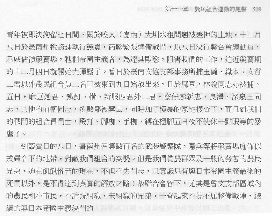 因此,我用比較極端的例子,來顯示當時農民跟嘉南大圳的緊張關係。1929年,台灣農民組合被總督府藉故彈壓,稱之為「二一二事件」,當時農組領導人簡吉遭到逮捕,入獄一年。