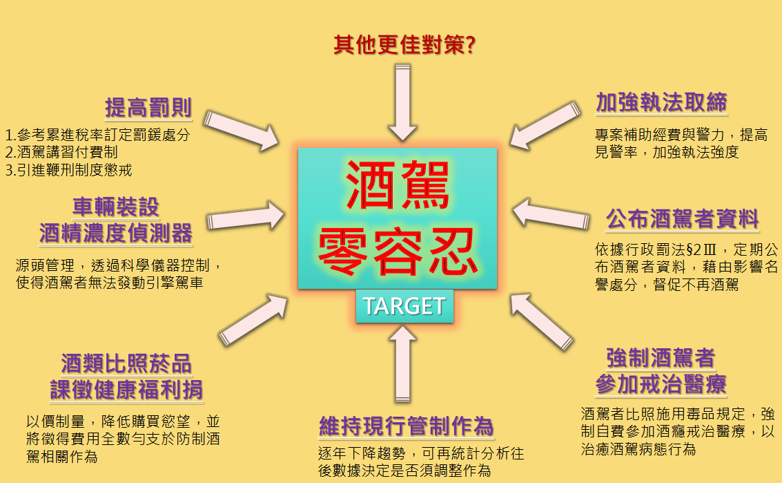 一、修法提高罰則:參考所得稅法第5條第1項規定,依照酒駕者每年綜合所得稅課稅級距及累進稅率,訂定不同級距之罰鍰處分,並從中提撥一定比例挹注警察機關執法取締用及賠償因酒駕造成之事故受害人損失。再者,將酒駕違規講習改為「付費制」,並針對再犯及肇事致人傷亡者,引進「鞭刑」制度,以收懲戒之效。