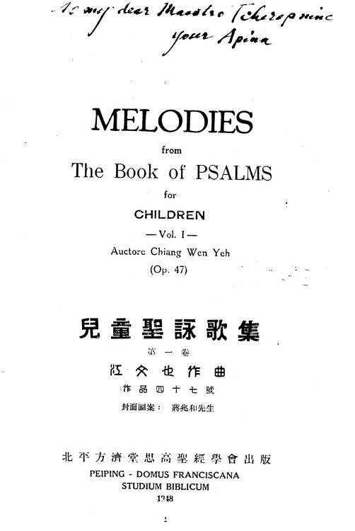 在台灣熱心人士組成「台灣光復致敬團」,積極到中國奔走營救之下,江文也終於出獄。出獄後,他認識了天主教神父雷永明,在墜入人生深淵時不斷地鼓勵他。因此,江文也協助創作了有史以來第一首中文歌詞譜曲的《天主教聖詠》,陸陸續續創作了許多聖歌。