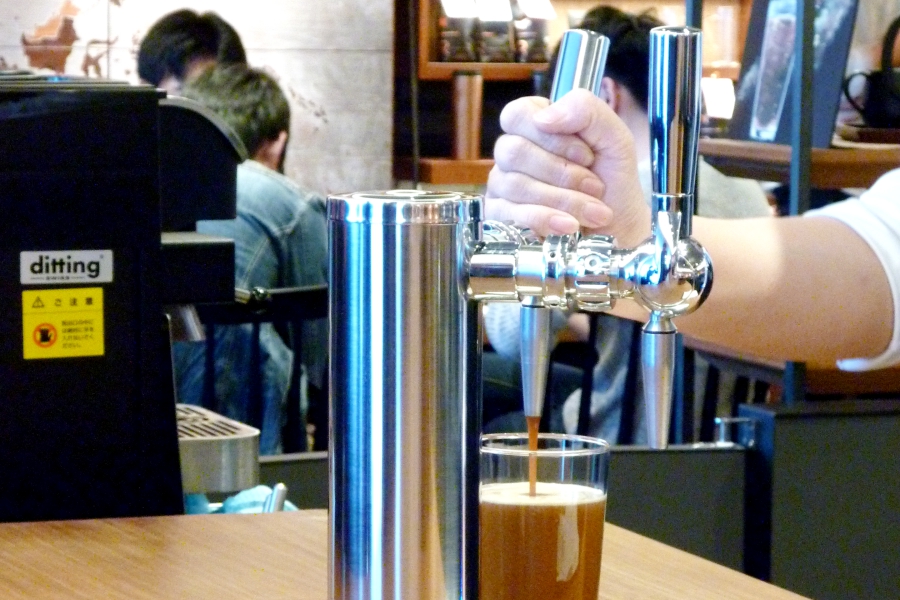 「請您觀察一下玻璃杯壁,這裡的咖啡會像瀑布一樣一層一層下沈,這樣漂亮的紋路變化,只有現在這個時刻才看得到,而隨著時間,咖啡的口感也都會不太一樣呢。」把頭髮往後俐落梳理的咖啡師,語調輕柔地解釋著,這是店內最有名、只有在這才能品嘗到的氮氣咖啡,雖然一杯要價超過千円日幣,卻是將近一半以上的客人都會點的人氣飲品。咖啡師一邊拉著拉桿,像注入生啤酒一般地注入咖啡,仔細地一一說明步驟,同時也不讓對話在沈默間乾涸,時不時找話題與你交談,最後再把咖啡放在杯墊上緩緩推到你的面前,如同酒吧中的Bartender——也是,這裡不是Café而是Bar,適當的溝通與調和、恰到好處的距離是關鍵。