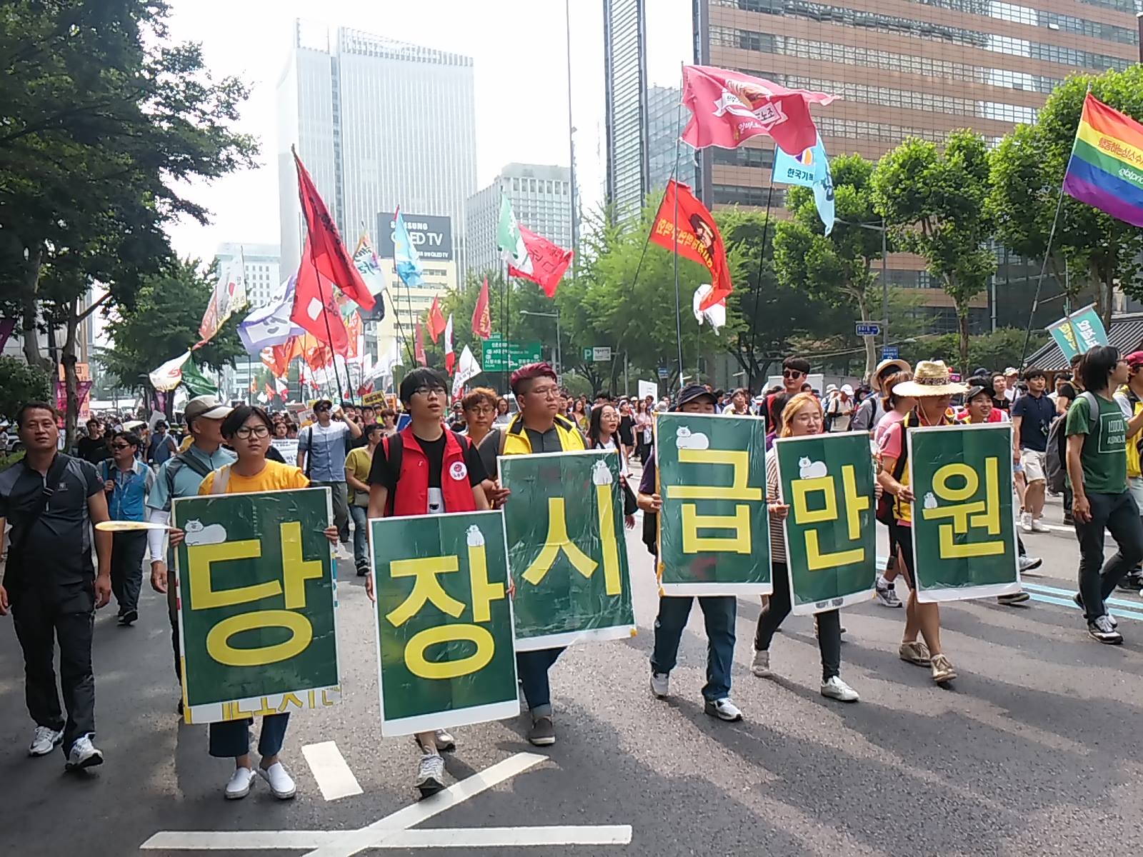 但勞界代表認為,調整154韓元,根本稱不上是提高。過去勞工界因自身提案都無法獲合理回應,且長期受保守派政權刻意忽略,勞界及工運團體仍堅持,應盡速調升至一萬韓元。民主勞總更因此從6月29日起,發起總罷工。參加者大多為包括清潔工、警衛、臨時教員與打工族等派遣與間接僱用的低薪勞工