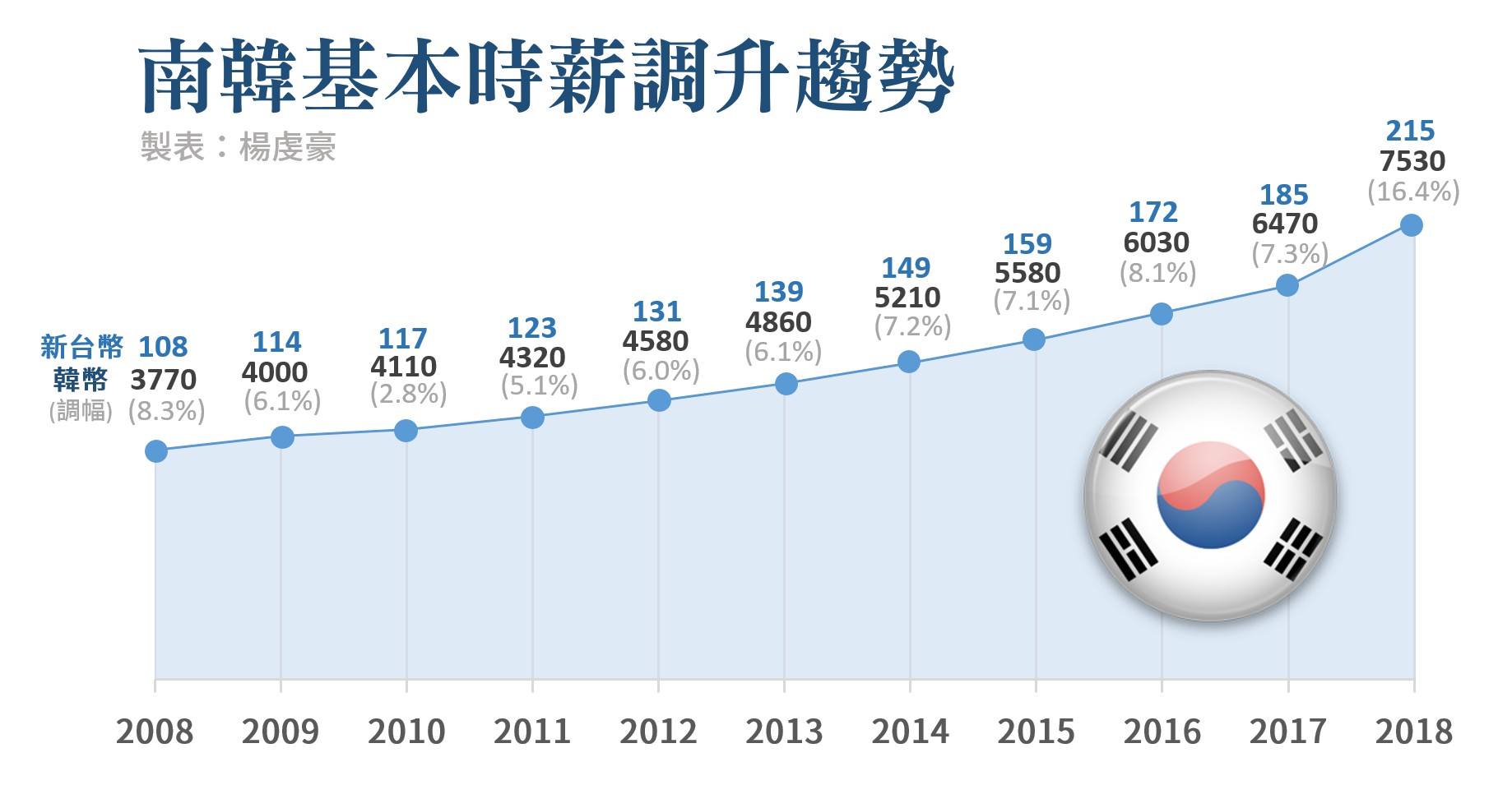 經最低薪資委員會多方交鋒協調後,南韓終於在15日敲定,2018年的基本時薪,將從今年度的6,470韓元,調高至7,530韓元,上升幅度達16.4%,成為16年來最大的調幅。基本月薪也因此從原本的135萬2230韓元(新台幣3.8萬元),大幅增加至157萬3370韓元(新台幣4.5萬元)。
