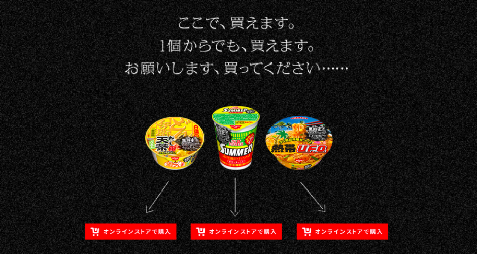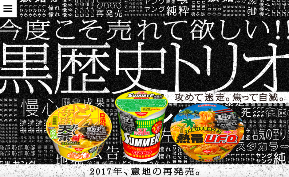 點開網站,會看見一個背景全是黑色雜訊的畫面,然後猛然跑出兩行標題「這次真的想要熱賣!黑歷史三重奏」,上下如跑馬燈般的兩條帶狀字串中,包含著「不人氣」、「在庫如山」、「自滅」、「必死」、「迷」、「失敗」、「嫉妒」、「黑」、「地獄」等超級負面的字眼,最後則是三項商品的照片,宣示「2017年,倔將再販售」。陳述著日清在夏季時多次因應風潮推出新商品,卻又不幸失敗的經驗,姿態放低地懇求消費者:「拜託各位了,請吃看看吧」。