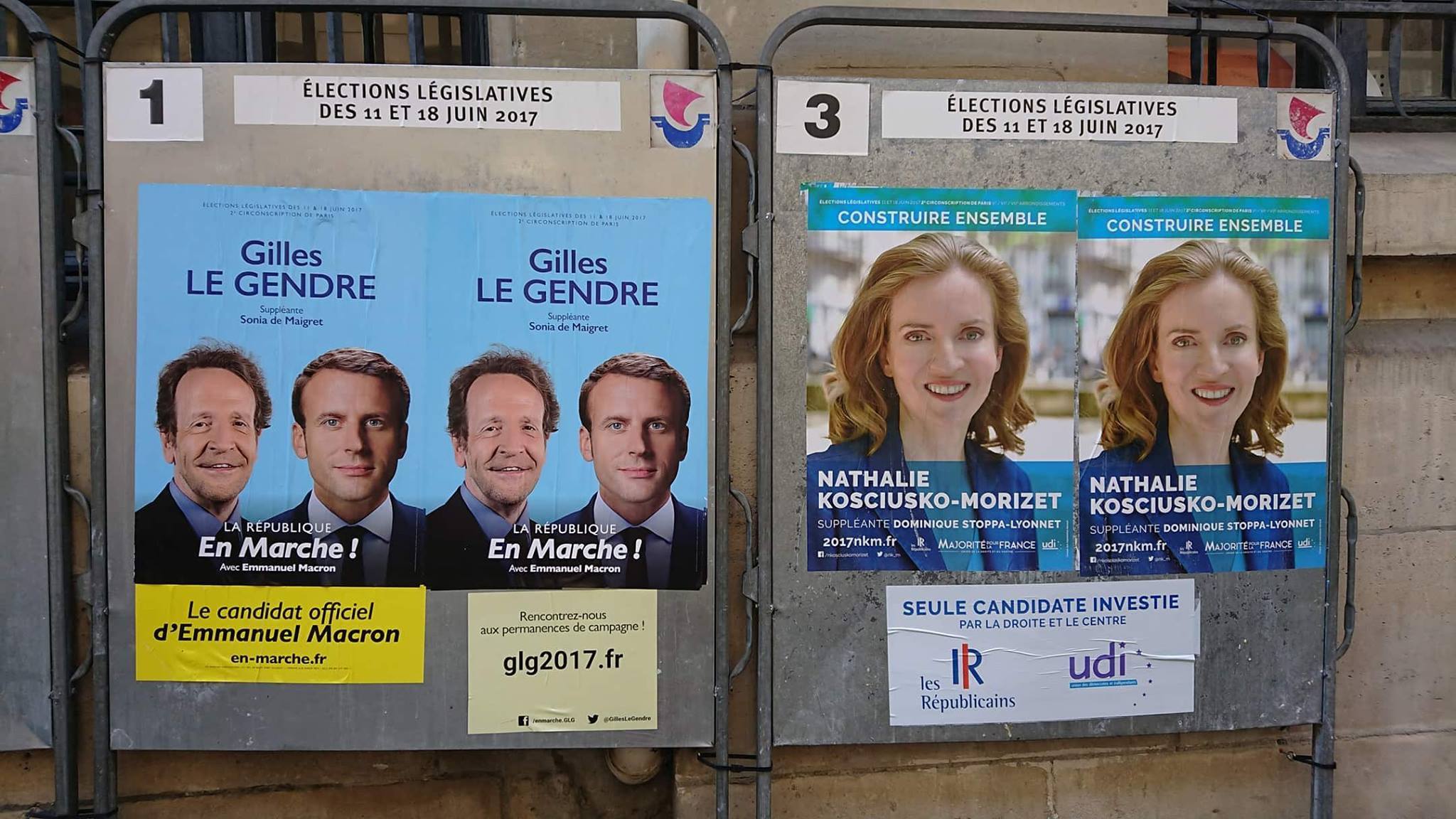總統大選結果衣尾效應的發揮,可以從另一項競選現象觀察得知。法國第五共和憲法的憲政體制,因為汲取了總統制與內閣制的若干機制,因而被稱為半總統制。在法國憲法上汲取總統制機制的規範中,有一項規定是,內閣成員不得兼任國會議員。因此為因應在國會選舉中獲勝的國會議員被徵召進入政府,由於政府閣員不得兼任國會議員而導致的議席空缺的狀況,在選舉法上設有「補足議席候選人」(candidat complémentaire)之規定。因此,不同於台灣民主化之後的歷次選舉,許多立法委員或以前的國民大會代表在競選海報上,紛紛刊登候選人和當時該黨的領導人或總統候選人合影;法國第五共和以來歷次國會議員選舉,候選人在海報上刊登的照片,幾乎都是候選人和該選區同政黨提名之「補足議席候選人」的合影。但是,本次總統大選衣尾效應充分發揮的狀況,就不同於前此的經驗。在本次國會大選,總統所屬政黨候選人的競選海報,一反過去常態刊登候選人與補足議席候選人合影的慣例,紛紛刊登候選人和新總統馬克宏的合影。