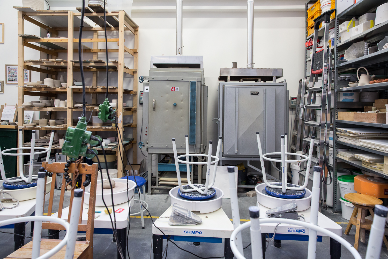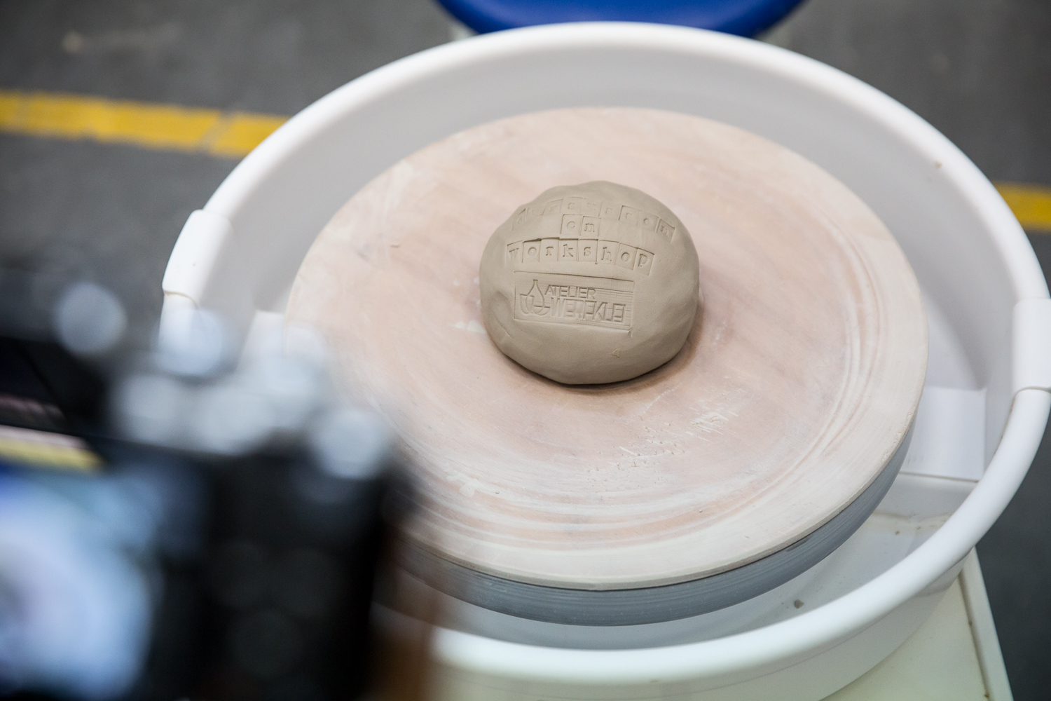 這裡就是今天主角的陶藝工坊,一進門馬上看到,中央兩排整整齊齊的拉胚機,四周圍牆上清清楚楚分為:烤箱、陶藝品、色料、工作台等不同區域,可說是麻雀雖小五臟俱全。主人Reinier很荷蘭地準備了一大壺咖啡上桌,並用自家超具人性、歪七扭八的杯子呈上招待,似乎已經預告,他所教的拉胚技巧的多樣與不拘泥。