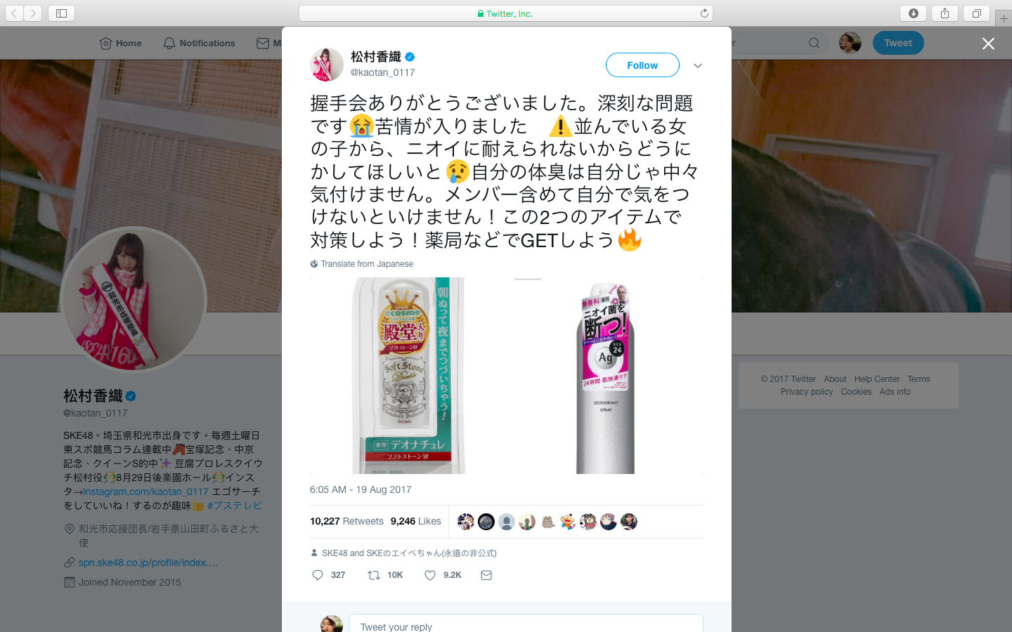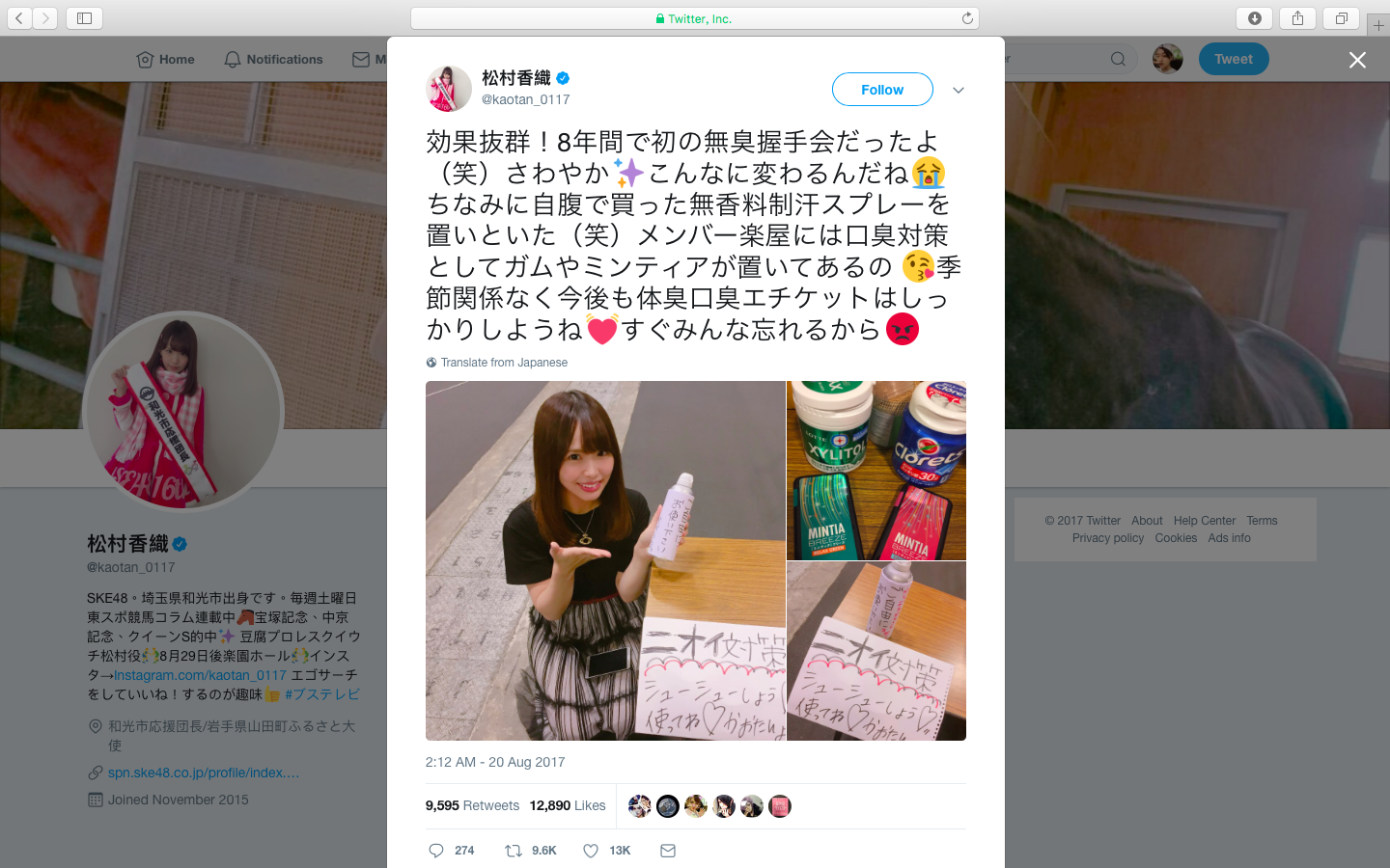 AKB48、SKE48等這些女子偶像團體,以「可以面對面的偶像」為理念,長期舉辦劇場公演與握手會,讓粉絲有親密接觸的機會,粉絲能從偶像身上獲得治癒,而偶像遇見的粉絲百百種,雖能夠直接受到暖心的鼓舞,卻可能要面對許多說不出口的煩惱,語言上的侵擾很傷人,手汗、體臭這些生理現象,更令人有口難言。不過SKE48的成員松村香織(還記得這位「禿頭偶像」嗎?請參考文章「【日本想想】 自爆禿頭又曾陪酒的AKB偶像,不行嗎?」)8月底時,在自己的推特上坦率地指出這項議題,她先感謝粉絲來參加握手會,但同時也指出自己接到了投訴:「一起排隊的女孩子說,沒辦法再忍受味道了,拜託做點什麼吧。自己的體臭,自己是沒辦法感受到的,我和成員們都認為必須要注意這件事!用兩件道具來解決吧!去藥局等地方GET它們吧」然後一起附上了制汗劑、拭汗濕紙巾的照片。
