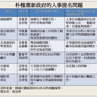 然而,出於個人的領導風格與行事作風,朴槿惠的行政團隊習於指揮命令卻疏於溝通協調。在人事任命案的過程中,又透露出內部審查機制的缺陷,使得提名者在國會聽政會的過程中,遭遇到外部諸多指責,當場卻難以有效的說明回應。