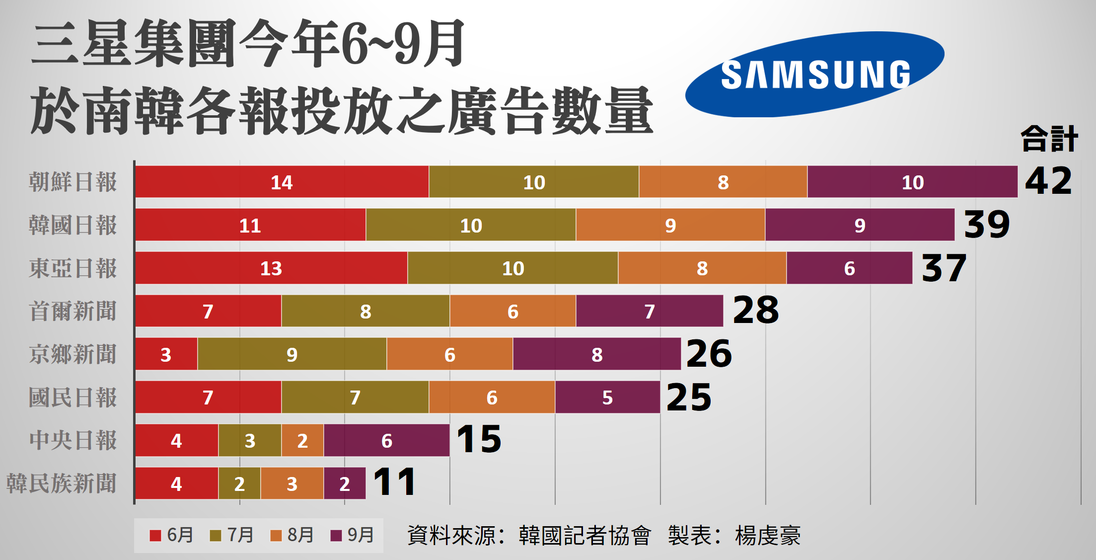 據韓國記者協會公布今年6到9月,三星集團在於南韓八大全國型主要早報的廣告份額統計數字,就能明顯看出差異。保守派的《朝鮮日報》和《東亞日報》獲得三星大量投放廣告。
