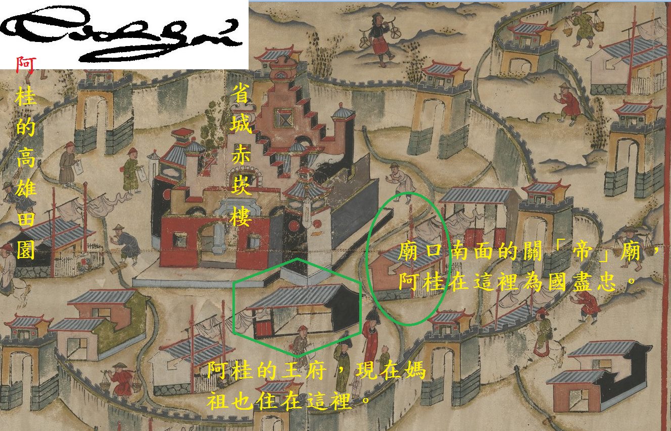 荷蘭紅毛番時代,東印度公司的街道設計,不知缺少哪一根筋(就中華文化價值來看),讓房子與臺灣西部溪流一樣,大部分坐東向西,阿桂住的王府也跟著坐東向西,所以他選擇廟口朝南的關帝廟見祖宗,王者南向。悲涼二也。關帝廟裡面有阿桂自己書寫的「古今一人」匾額,他選擇在古今一人之前懸梁,悲涼三也。