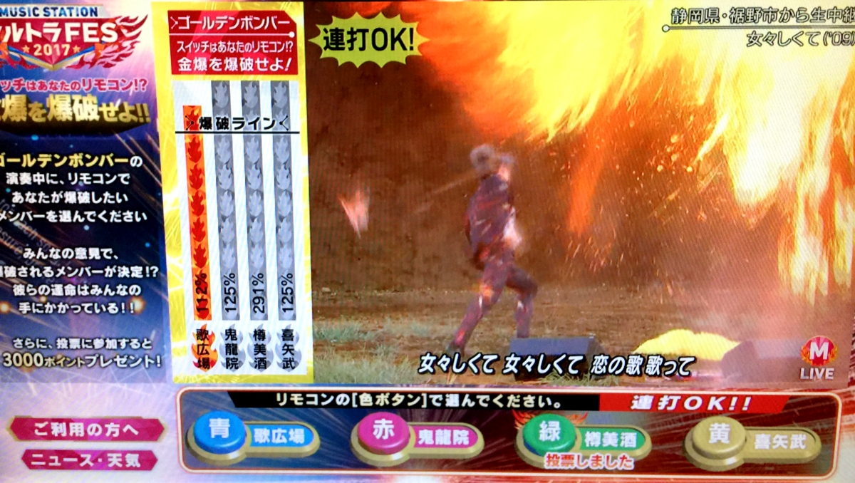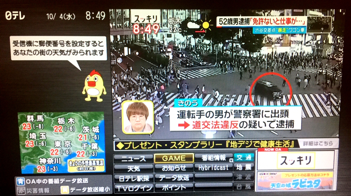 隨著節目不同,還可能和電視機內的人一起「互動」,再配合遙控器上的青、赤、綠、黃四色按鈕,就能再做更多變化了,比如玩遊戲或投票,花樣相當多。日本電視台的晨間情報節目《ZIP!》,每天在節目中會舉行三次的猜謎環節,觀眾按下代表選項的其中一色,便能答題,答對後就能獲得點數,一旦點數累積到一定程度,就能參加抽獎活動。朝日電視台老字號音樂節目《Music Station》,在今年9月18日轉播的特別節目中,在空氣搖滾團體金爆的表演環節時舉辦了「你想讓誰爆炸」的投票,四種顏色剛好各代表四位團員,最高票者背後設置的「炸彈」就會爆炸。