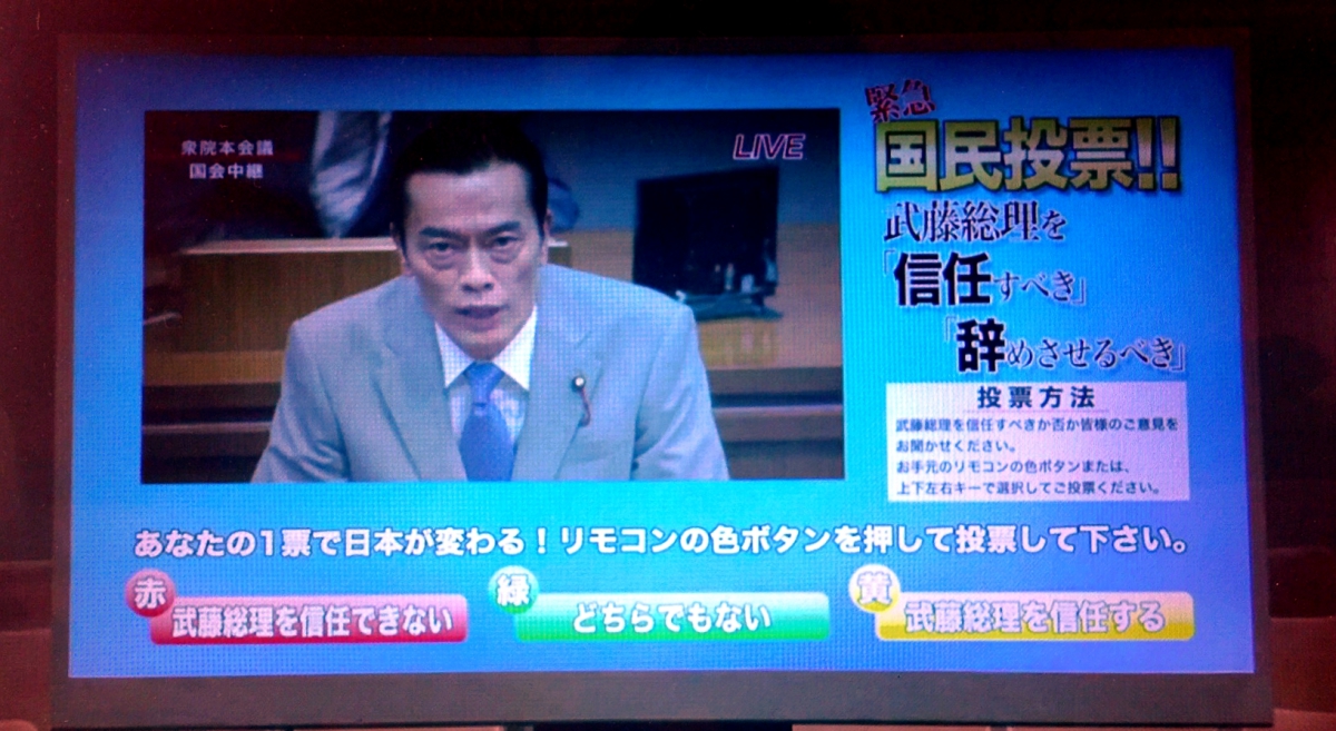 2015年於東京電視台播出的深夜政治喜劇《民王》,也在劇情中加入了d按鈕的使用。《民王》的最後一集描述到,男主角武藤泰山(遠藤憲一 飾)在國會選舉中獲得勝利,得以再度登上總理之位,但他還是希望可以直接「聽到」民眾的聲音,所以請電視機的觀眾新任的總理希望「投票權」直接訴諸人民,請大家按下d按鈕,若是覺得「武藤總理無法信任」,就按下遙控器上的紅色鍵;若覺得「無所謂」者就按下綠色鍵;選擇「相信武藤總理」的話,則按下黃色鍵。聽起來很像天方夜譚,似乎也有些太不謹慎,但只要設計得宜,加上觀眾的參與度,d按鈕似乎就能發展出更多想像與使用,更像一種最直接最即時的「民意調查」,能直接獲得回饋。