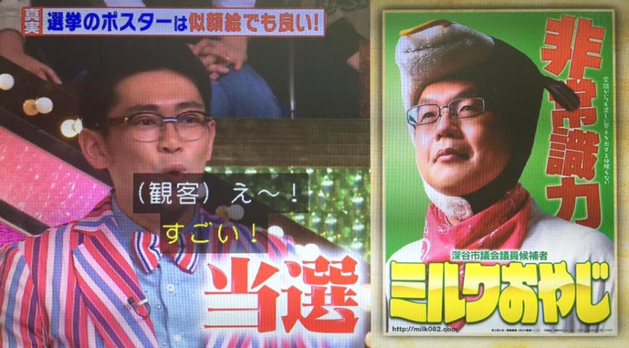 雖說競選海報的規格、張貼規矩等客觀條件有許多限制,海報本身的內容則是任其「自由」表現,即使大家心中大概都有一把尺,但也常常會有候選人突發奇想,把這份自由延伸再延伸。在規則中,並未限制選舉人在海報上只能放什麼照片,所以一位在埼玉縣深谷市想要競選市議員的大叔,便戴上乳牛的頭套、並且以「牛奶老爹(ミルクおやじ)」為名,投入選舉活動名字(是的,可以用綽號來競選),雖然要吸引人目光的意圖明顯,但他其實是一位熱愛牛與牛奶的在地酪農,所以戴上乳牛頭套、取名「牛奶老爹」似也是有跡可循,表面看似不太「正統」,但他私底下卻有在深耕地方,最後仍是順利當選,還連任兩屆,目前仍為現任市議員,不過,在議會中的名字則改為戶籍上的村川德浩,網站上的市議員名冊裡,雖然無法戴上象徵初心的乳牛頭套,但還是在領帶上小「叛逆」了一下,使用了乳牛花紋。