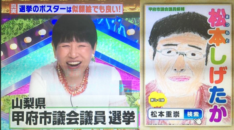 同樣在海報上出花招的,還有另外一位松本重崇先生,他想在山梨縣甲府市競選市議員,便請姪子為他繪製似顏繪,然後直接拿來印在海報上,似是想要營造出家庭溫馨感,可惜這份溫暖沒有傳遞到選民心中,沒有牛奶老爹的好運氣,松本先生遺憾落選。
