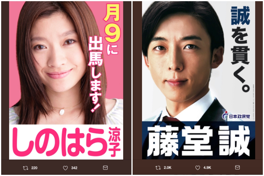 作為一種設計技巧,娛樂圈也常運用「選舉海報風」風格當作視覺效果,比如說今年10月將播出的日劇《民眾之敵》,故事以一位家庭主婦決定投身政治活動的過程為主,在宣傳日劇期間,就為女主角篠原涼子,以及其他演員高橋一生、前田敦子、千葉雄大等人都做了選舉海報風的宣傳海報,就算什麼也都沒解釋,但一看就會知道這是一部以政治為主的故事。