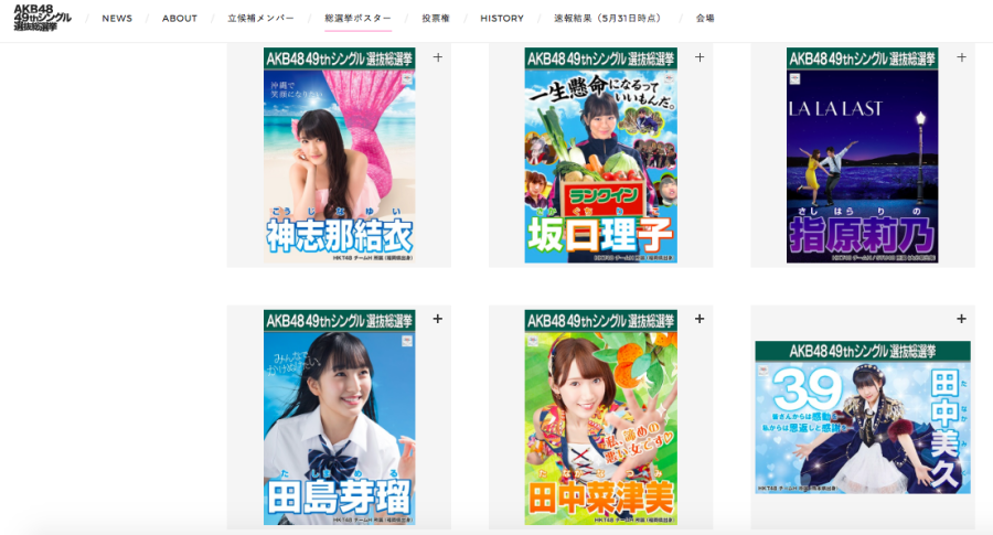 而日本女子偶像團體AKB48和姐妹團們,每年6月都會舉行一場「總選舉」,粉絲透過買單曲、參加會員等途徑獲得投票機會,就能將票投給自己喜歡的成員,經由這項人氣投票的排名,登上冠軍寶座的人,將可以在下一張單曲站在center之位,其他排名優異的成員,便能在之後的作品與音樂節目中獲得較好的位置與露出機會。偶像的世界中,知名度與露出度亦是關鍵,所以在總選舉期間,女孩們也透過遞交報名表、錄製簡單的「政見」發表等仿照實際選舉流程,以拉高選舉熱度,也會發表自己的宣傳海報。雖然海報大多都很「惡搞」,卻因為海報的配置與氛圍,讓人一看就知道是在模仿選舉海報風格。
