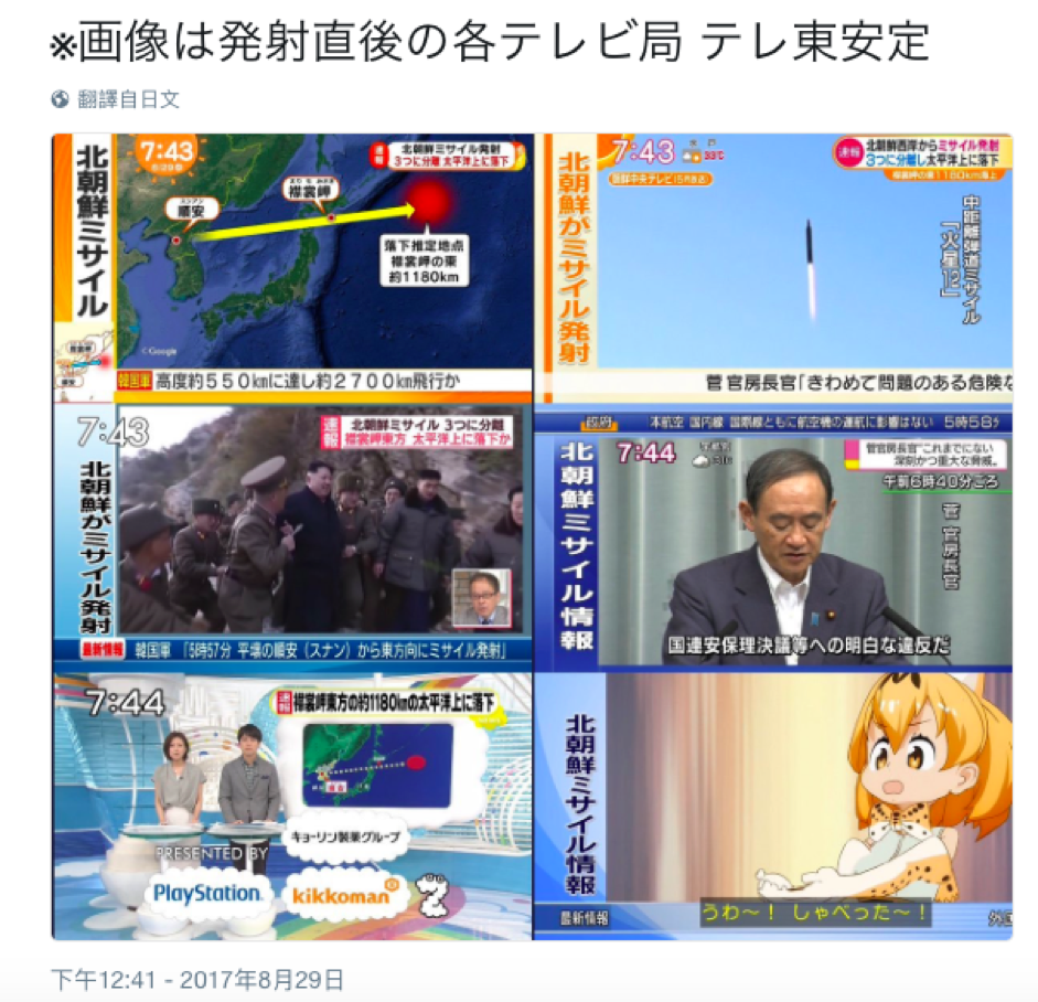 比如說2015年、2016年颱風時,就有人截圖比較,各家電視台不是在報颱風,就是以跑馬燈顯示資訊,唯獨東京電視台老神在在,該播什麼就播什麼;2017年8月29日北韓試射飛彈飛越日本上空,各家電視台自然都嚴陣以待,這回東京電視台總算跟進了跑馬燈,不過預定的動畫依舊照常播送。事件的輕重緩急對每個人的定義也許不同,截圖可能也有所時間差,多少有誇張之嫌,但遇上任何重大事件總是「處變不驚」、照計畫走的步調卻很真實,也難怪大家總要高呼一聲「安定的東京電視台」了。反過來,也有網友稱,當東京電視台不再維持「正常」畫風,那日本可能就真的很「危險」了。