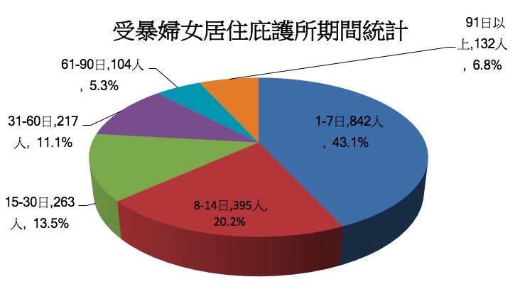 那麼,台灣受暴婦女在庇護所裡通常待多久呢?根據衛福部統計,2015年有1,953位婦女入住庇護所,居住日數總計為52,404天,平均一位婦女居住26.8天、接近一個月。而依照居住日數的話,高達43.1%的受暴婦女在入住1週內會離開庇護所,其他五分之一的婦女在2週內也會離開,僅有6.8%的婦女可以住在庇護所超過3個月。
