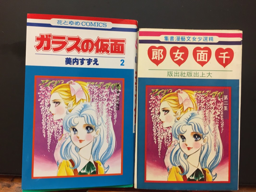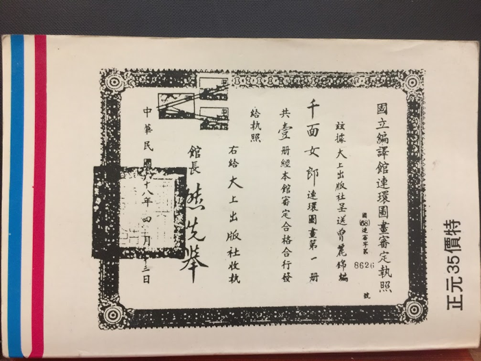 這是因為當初引進這部漫畫的時候,還沒有版權約束,「千面女郎」是台灣的出版社自行取的書名。早期的大上版本,連作者的名字都不見蹤跡,內文也完全抹去日本痕跡。例如女主角出身橫濱的中華料理店,大上版本只說是A市的小飯館。人名一律本土化,「秋俊傑」好像瓊瑤小說裡的名字,「白莎莉」讓人想到七〇年代的美麗主持人白嘉莉(而且白莎莉的媽媽正好叫作白嘉芳),「阮玉冰」的悲劇色彩是不是有點像阮玲玉?地名全變成A市、F市,電影看板「伊豆的舞孃」字樣也變成一片空白。由於戒嚴時期漫畫皆須經過國立編譯館審定,審查辦法又很空泛,全憑審查人主觀認定,東洋味過重說不定會有風險,因此書名改為「千面女郎」,作者改署「曾麗錦」編(不知是否為譯者的名字),盡可能抹去日文痕跡。就像七〇年代的日本卡通「科學忍者隊」在台灣也硬生生變成「科學小飛俠」,以避開「忍者」這種可能惹議的東洋詞彙。