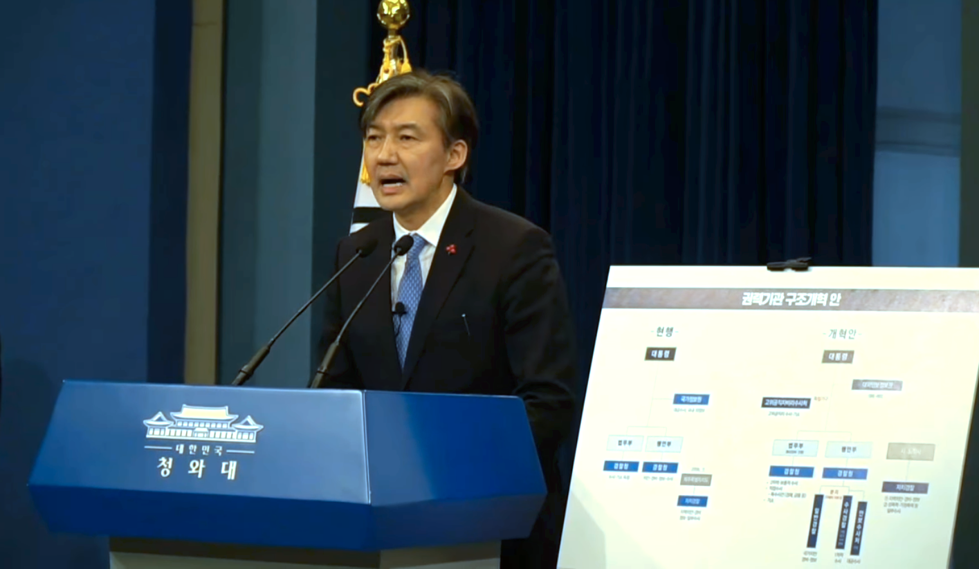 調整權力機構是南韓啟動司法改革,第一道需要面對的課題,特別是南韓檢調獨佔搜查與起訴權,卻時常被人詬病聽命政府指令行事而濫權,而在李明博與朴槿惠兩任保守派政權時期,總統皆任命檢調體系出身者,擔任青瓦台秘書官,形成政府權力與檢調間的利益糾葛與威逼體系,檢調中立性蕩然無存。