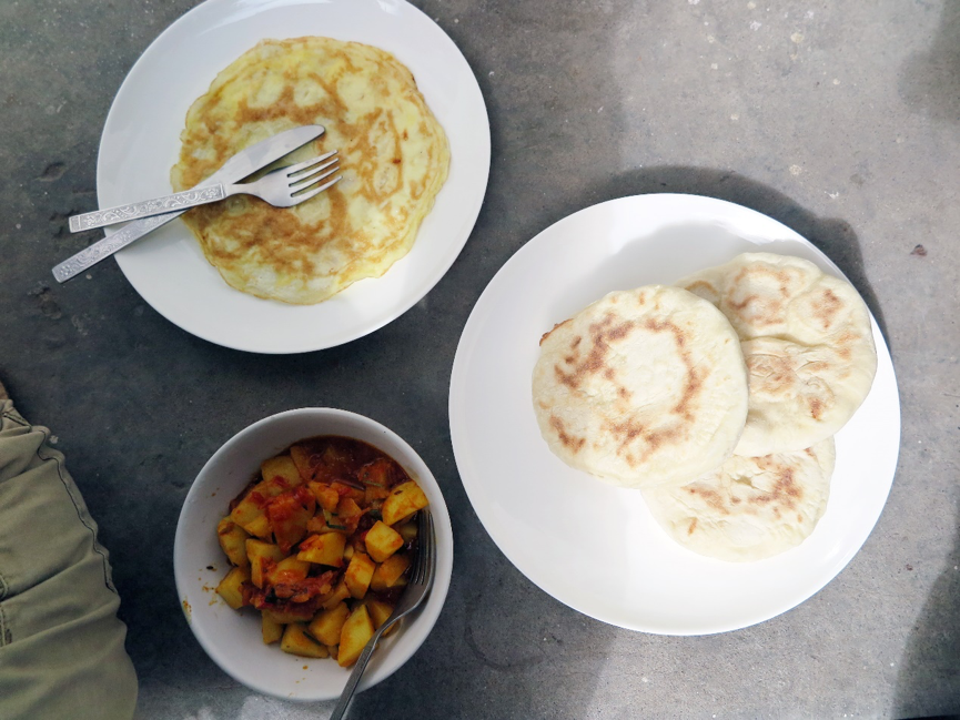磚砌流理臺鋪著光潔的大理石石板,麵粉直接灑在石板上,邊角虛掐了幾個麵團、一盆馬鈴薯泥。聽說布洛的餐廳裡,填馬鈴薯泥的扁煎餅賣得極好,餅的印地語叫「阿魯葡蘭達」(Aloo Paratha),是北印地區常見的早餐主食。