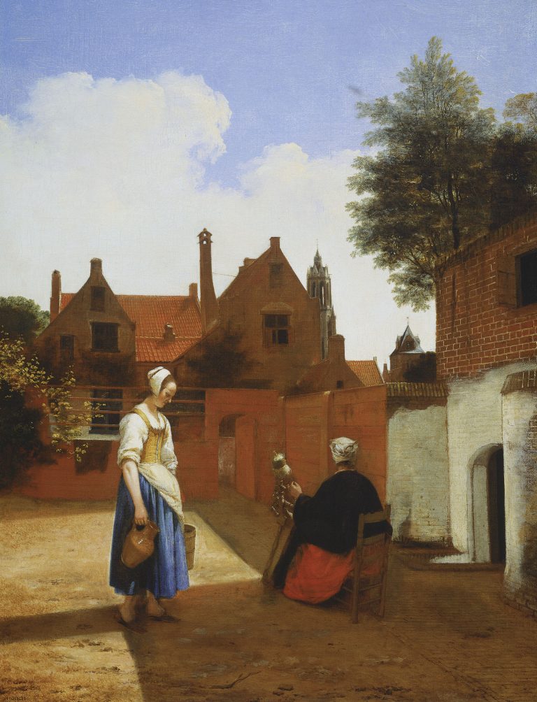 這裡是台夫特(荷屬東印度公司會所之一) 一戶尋常的庭院:遠景的兩個建築,較高的是新教堂,另一則是市政廳。人物身著的顏色引領著我們的目光停留在這兩位僕人身上:一位正紡紗(代表女性美德),另一位手提水桶及水壺,並謙虛地垂下頭。霍赫利用畫筆讓畫作中的她們顯得更勤奮、高雅。 透由光線的描繪,庭院地上的日光和紅磚瓦,與純淨的藍天形成強烈對比。而屋頂上方的白雲,代表暴風雨剛過,雨後的陽光讓一切感覺更加清新。史學家推測,畫中陽光具有隱喻:祝福有道德之人。 這幅畫作體現十七世紀藝術從貴族走近人民日常生活。