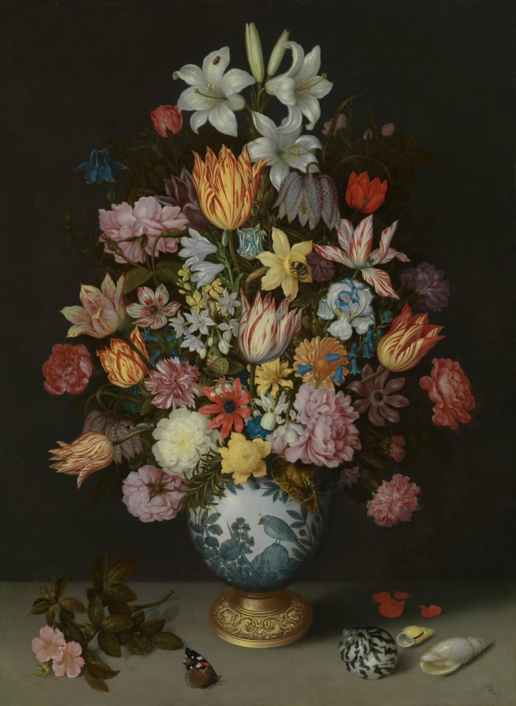 畫中這只精緻陶瓷花瓶是VOC從亞洲進口至荷蘭的典型代表,中國瓷器象徵財富、品味,也為彰顯荷蘭的全球貿易盛況。這時期低地國的靜物畫通常代表某種寓意,如花卉暗喻無常、世間的享樂皆是短暫且易逝,這即是十六、十七世紀的尼德蘭所盛行的Vanitas畫類,當中含有世界是虛幻且稍縱即逝的寓意。如這幅看似花團錦簇的花束,其實並不會同一時間盛開,且最終必會凋落。美麗細節中也隱藏著道德意涵。