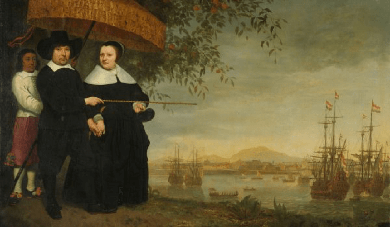 身著黑色裝束的男士,是荷屬東印度公司貿易商,歷史學家研判很可能是Jakob Martensen及其妻子。身後的奴隸為他們持著遮陽傘(pajong)。背景是當時荷屬東印度公司(VOC) 亞洲總部–巴達維亞城堡Batavia Castle (今雅加達)。右前景可以看見東印度公司船艦準備啟航返回荷蘭。而Jakob Martensen正指向船艦象徵著他的參與。 荷蘭畫家Cuyp未曾到訪義大利,卻深受義大利畫風影響。其作品風景富有典型地中海氛圍,而朦朧的畫風、筆觸也更加突顯畫中人物的重要。