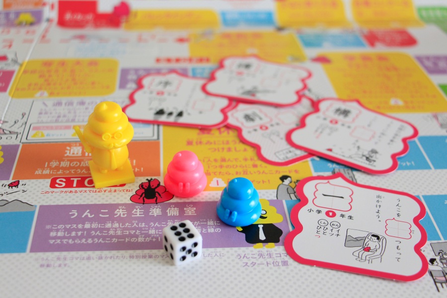 因為某些原因加上好奇心,我購買了便便漢字的紙上大富翁遊戲,顧名思義,玩法就是便便漢字練習簿的大富翁遊戲版本,每個棋子代表一位玩家(棋子的造型自然是便便),透過骰子來決定步數,同時進行抽牌。每張牌上都有要學習的漢字與例句,停留的格子則可能有一些任務要達成,比如用屁股寫出手上其中一張牌的漢字,或是在五秒內念完三遍便便例句,還有用唱歌的方式唱出例句等。平心而論,作為一名大人,一邊玩也是覺得有些尷尬,但身為一個語言學習者,透過雙關、擬聲詞以及不斷想吐槽「到底在說些什麼啊」的歡樂例句,還是讓人覺得輕鬆又可愛,成為大人後無法輕易在公共場合說出的字眼,可以大聲地念出來,也是另一種小叛逆的痛快了。